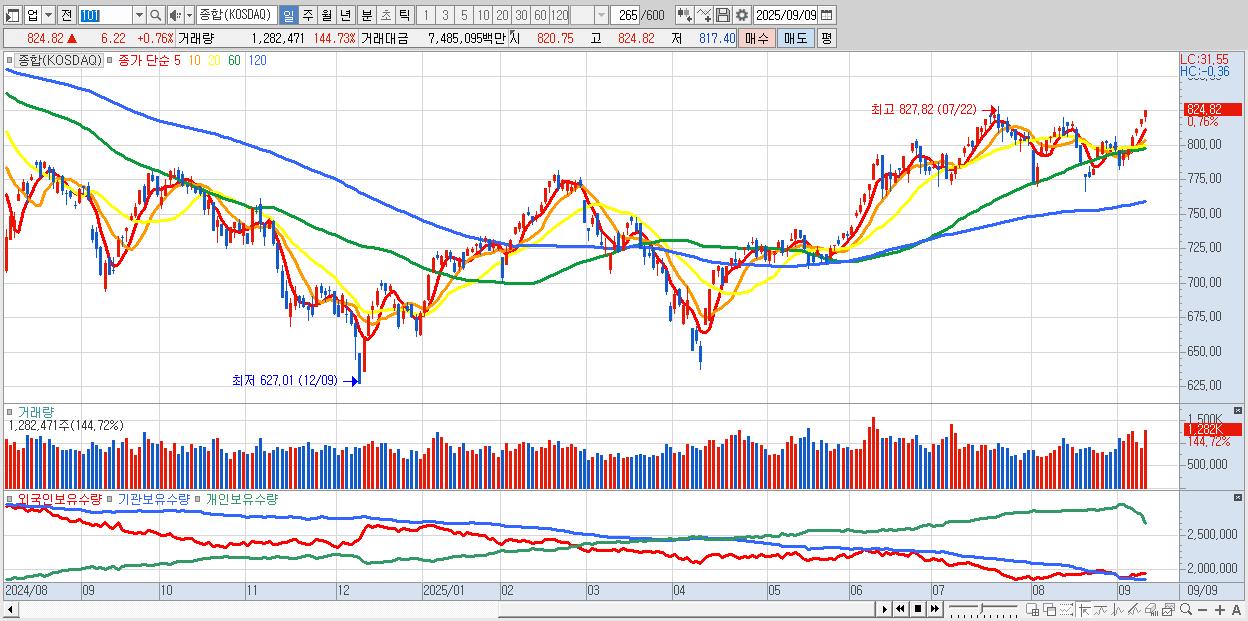 | 09/09 | 824.82 | ▲0.76% | -202억 | 233억 | -42억 | 11억 |