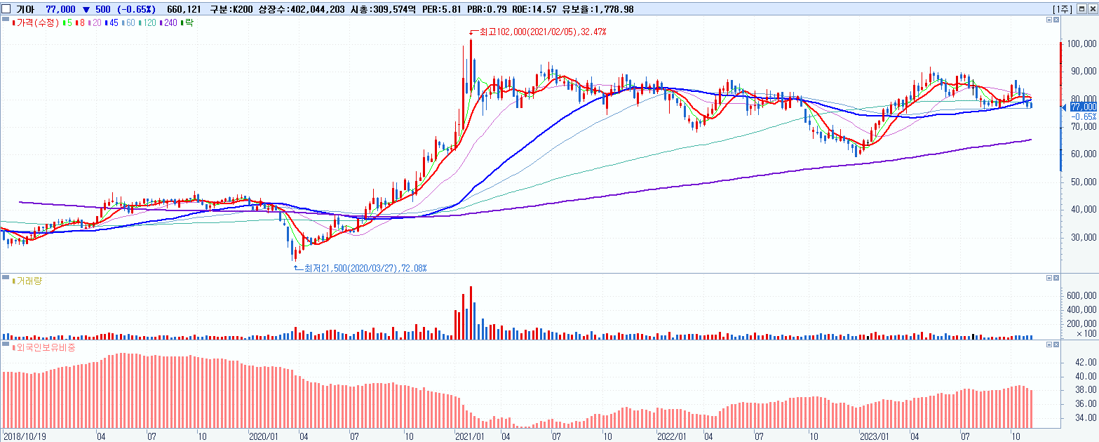 - 기아 (77,000원 ▼ -0.77% , 시총: 309,574억, 거래량: 5,903,722, 거래대금:4,595억, KOSPI)