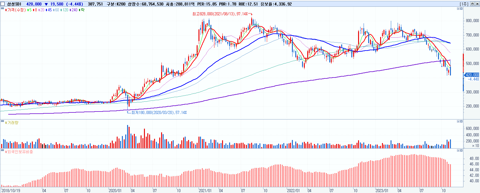 삼성SDI 420,000원 ▲ -7.49% (KOSPI, 006400)