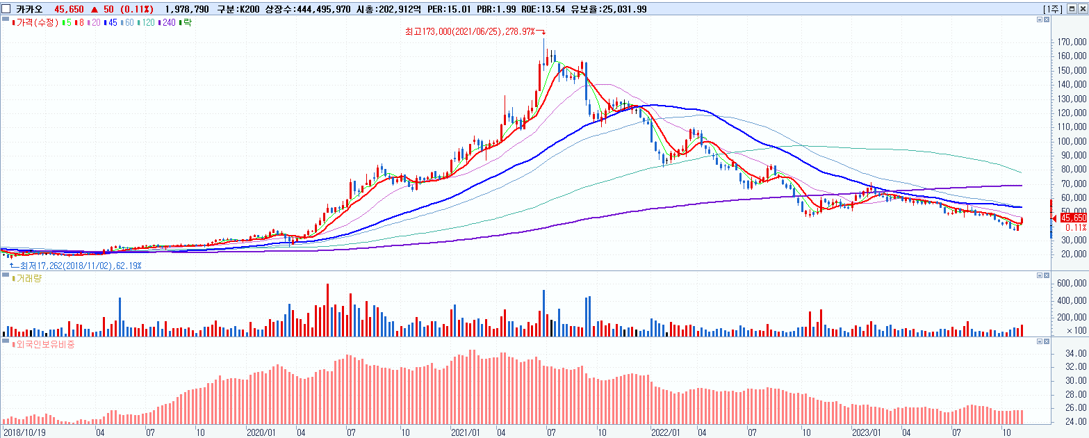 - 카카오 (45,650원 ▲ 10.53% , 시총: 202,912억, 거래량: 13,588,083, 거래대금:6,029억, KOSPI)