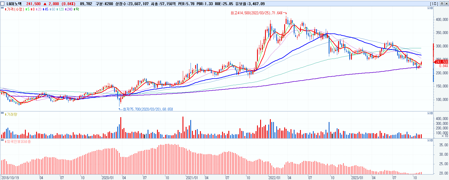 - LG이노텍 (241,500원 ▲ 6.62% , 시총: 57,156억, 거래량: 803,491, 거래대금:1,915억, KOSPI)
