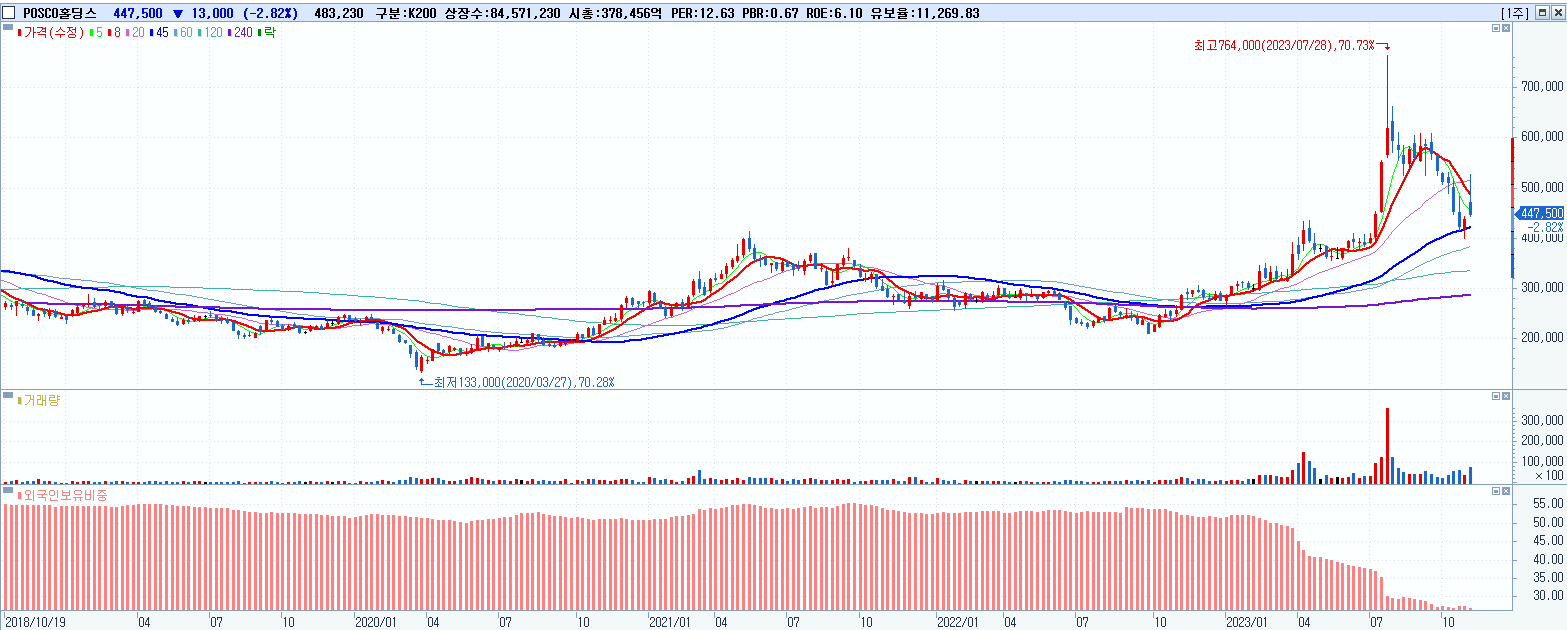 - POSCO홀딩스 (447,500원 ▲ 2.17% , 시총: 378,456억, 거래량: 7,918,501, 거래대금:38,136억, KOSPI)