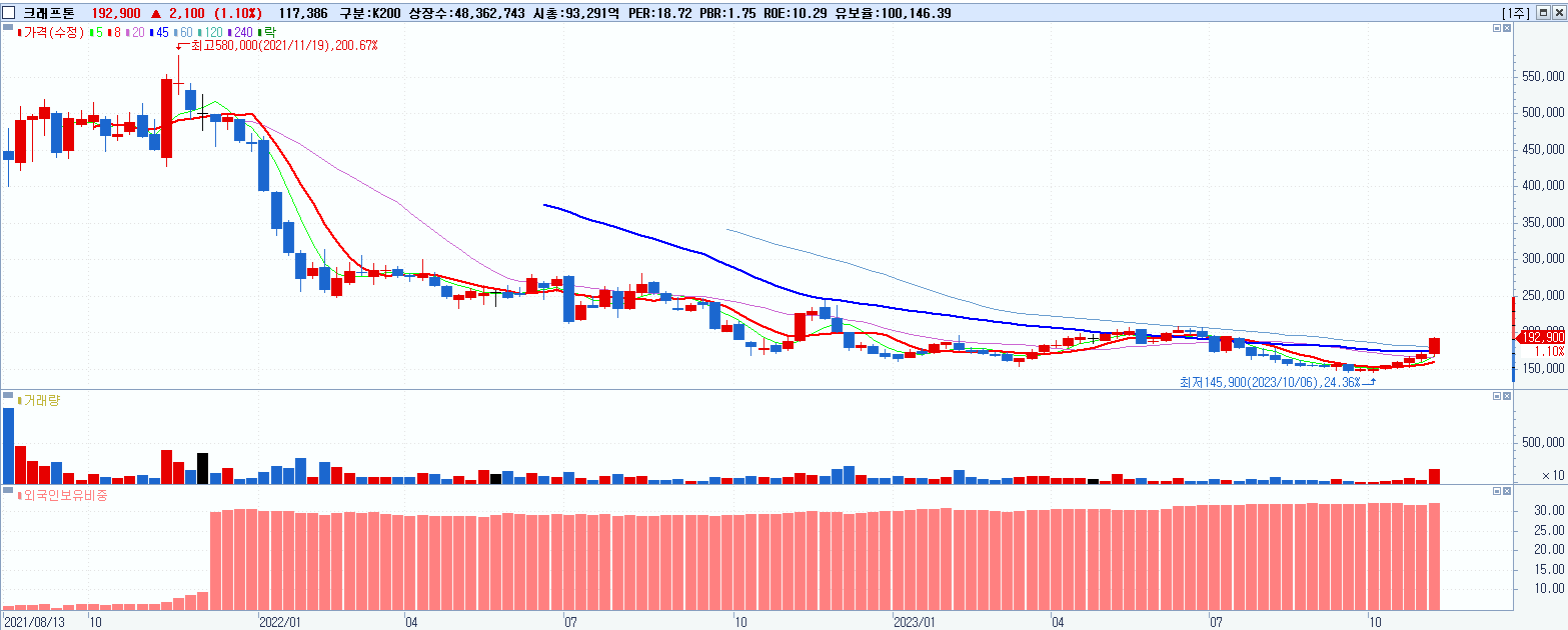 크래프톤 192,900원 ▲ 13.54% (KOSPI, 259960)