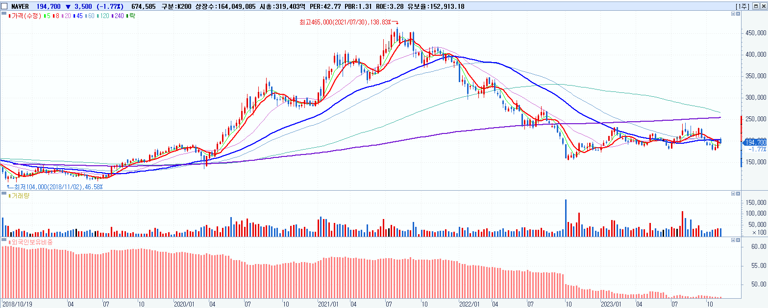 - NAVER (194,700원 ▼ -2.89% , 시총: 319,404억, 거래량: 3,635,860, 거래대금:7,255억, KOSPI)