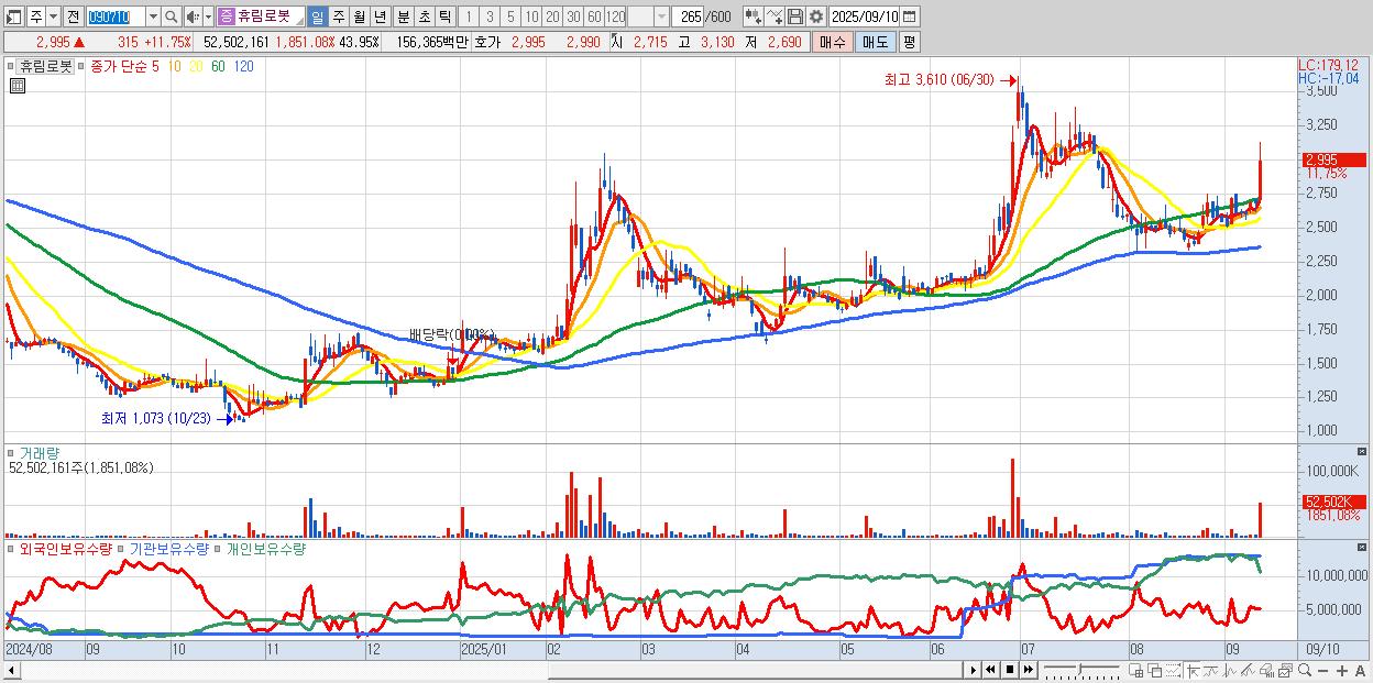 - 휴림로봇 (2,995원 ▲ 11.75% , 시총: 3,578억, 거래량: 52,502,161, 거래대금:1,564억)