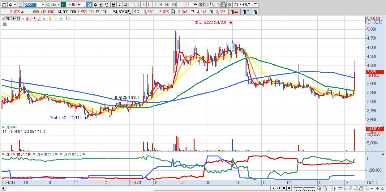 - 싸이버원 (3,825원 ▲ 18.6% , 시총: 457억, 거래량: 14,000,900, 거래대금:548억)