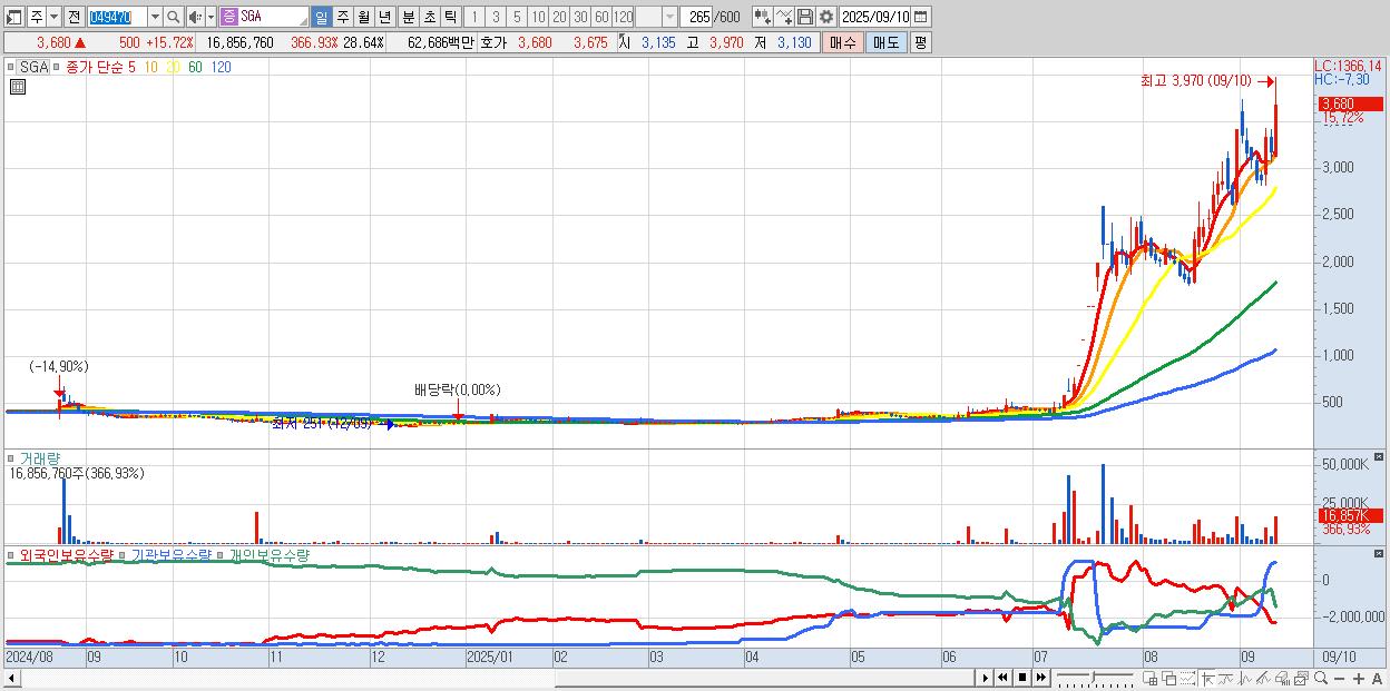 - SGA (3,680원 ▲ 15.72% , 시총: 2,166억, 거래량: 16,856,760, 거래대금:627억)