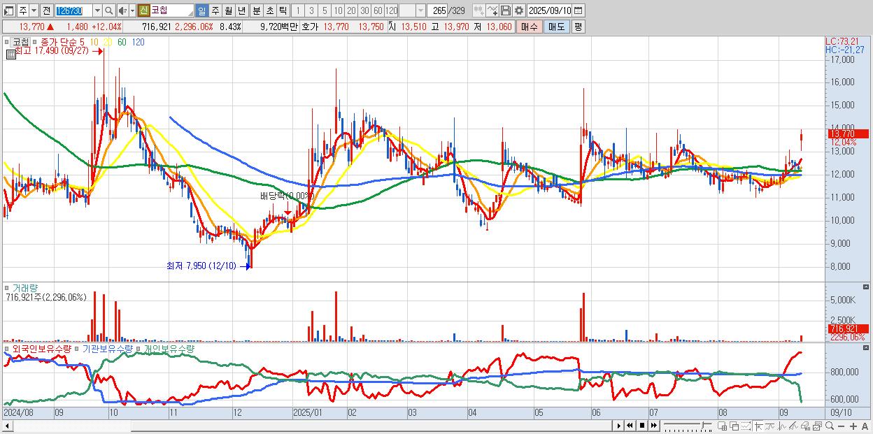 - 코칩 (13,770원 ▲ 12.04% , 시총: 1,171억, 거래량: 716,921, 거래대금:97억)