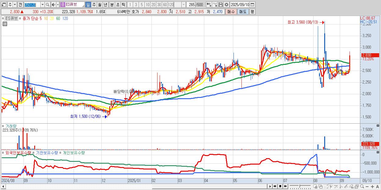 - ES큐브 (2,830원 ▲ 13.2% , 시총: 384억, 거래량: 223,328, 거래대금:6억)