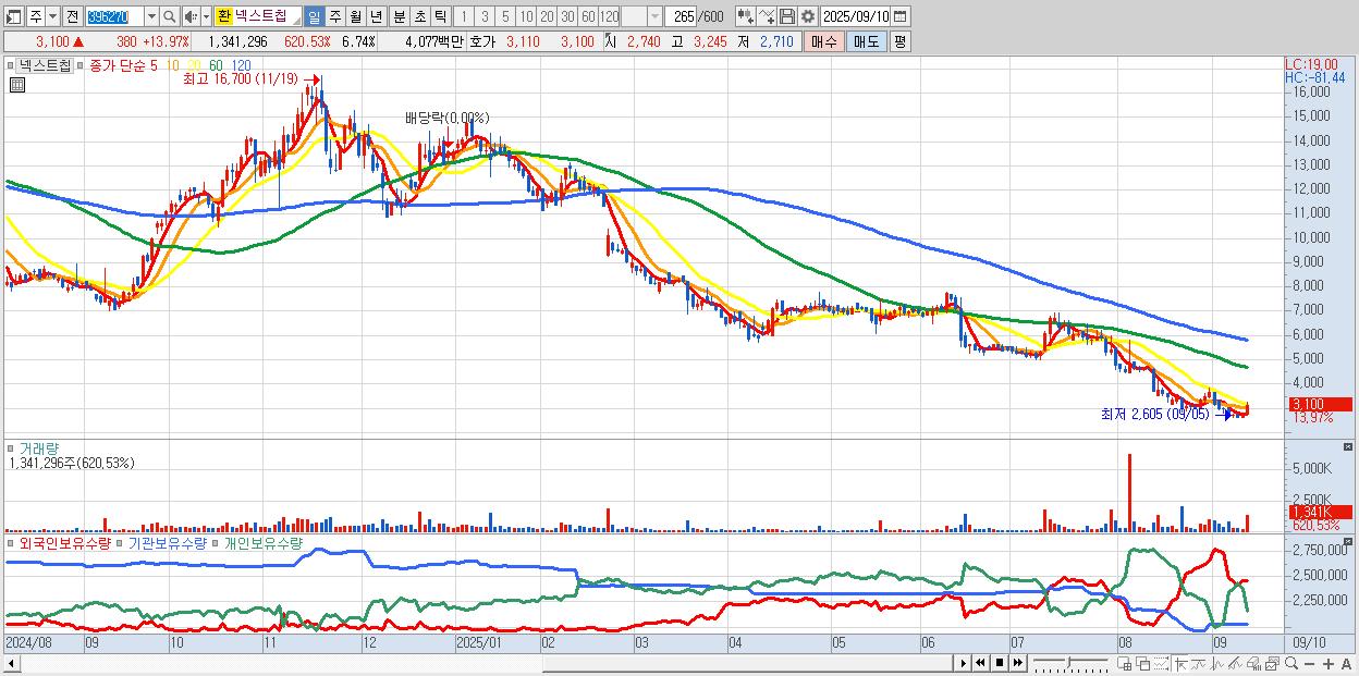 - 넥스트칩 (3,100원 ▲ 13.97% , 시총: 617억, 거래량: 1,341,296, 거래대금:41억)