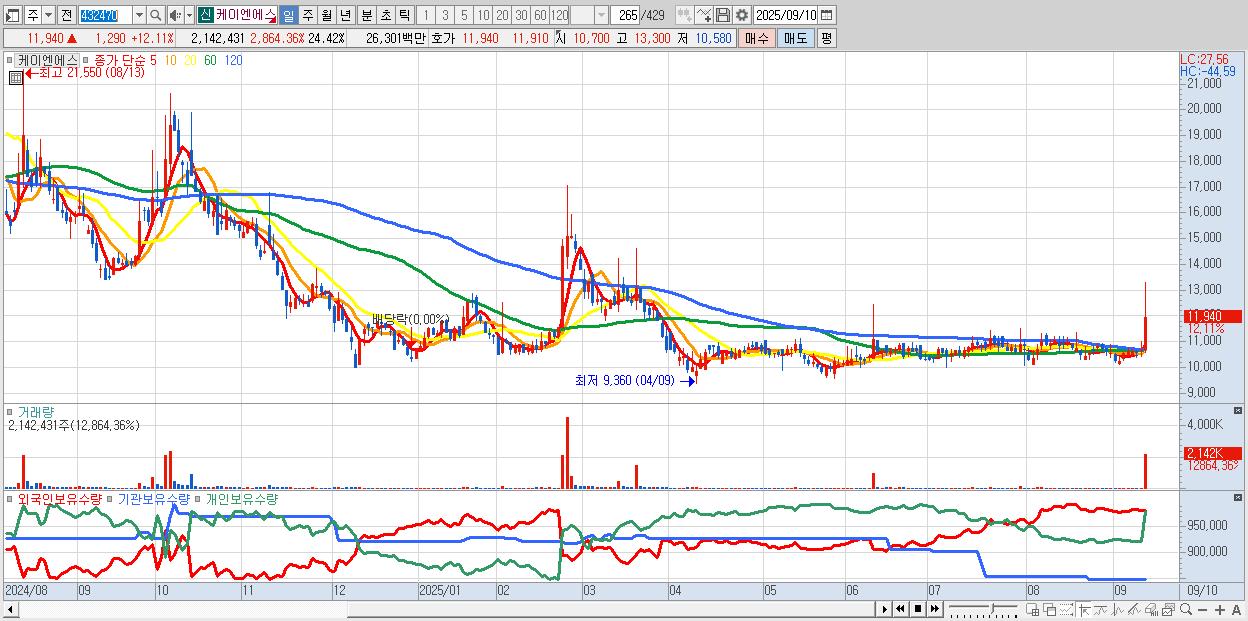 - 케이엔에스 (11,960원 ▲ 12.3% , 시총: 1,049억, 거래량: 1,179,909, 거래대금:145억)