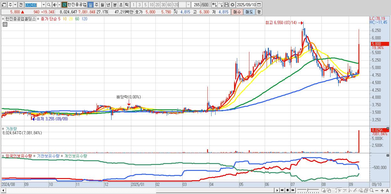 - 한진중공업홀딩스 (5,800원 ▲ 19.34% , 시총: 1,713억, 거래량: 8,024,647, 거래대금:472억)