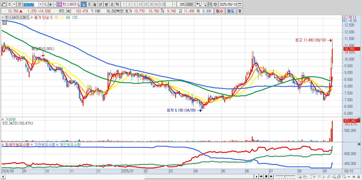 - 한스바이오메드 (10,760원 ▲ 14.59% , 시총: 1,455억, 거래량: 972,342, 거래대금:102억)