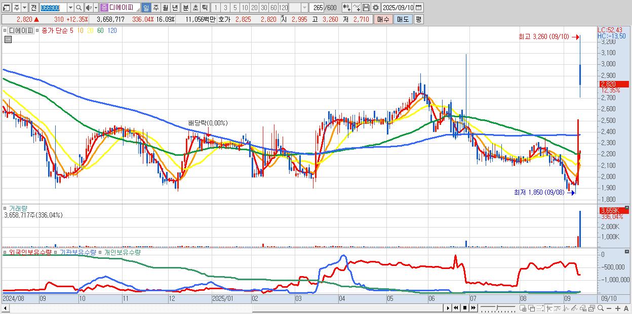 - 디에이피 (2,820원 ▲ 12.35% , 시총: 641억, 거래량: 3,658,717, 거래대금:111억)