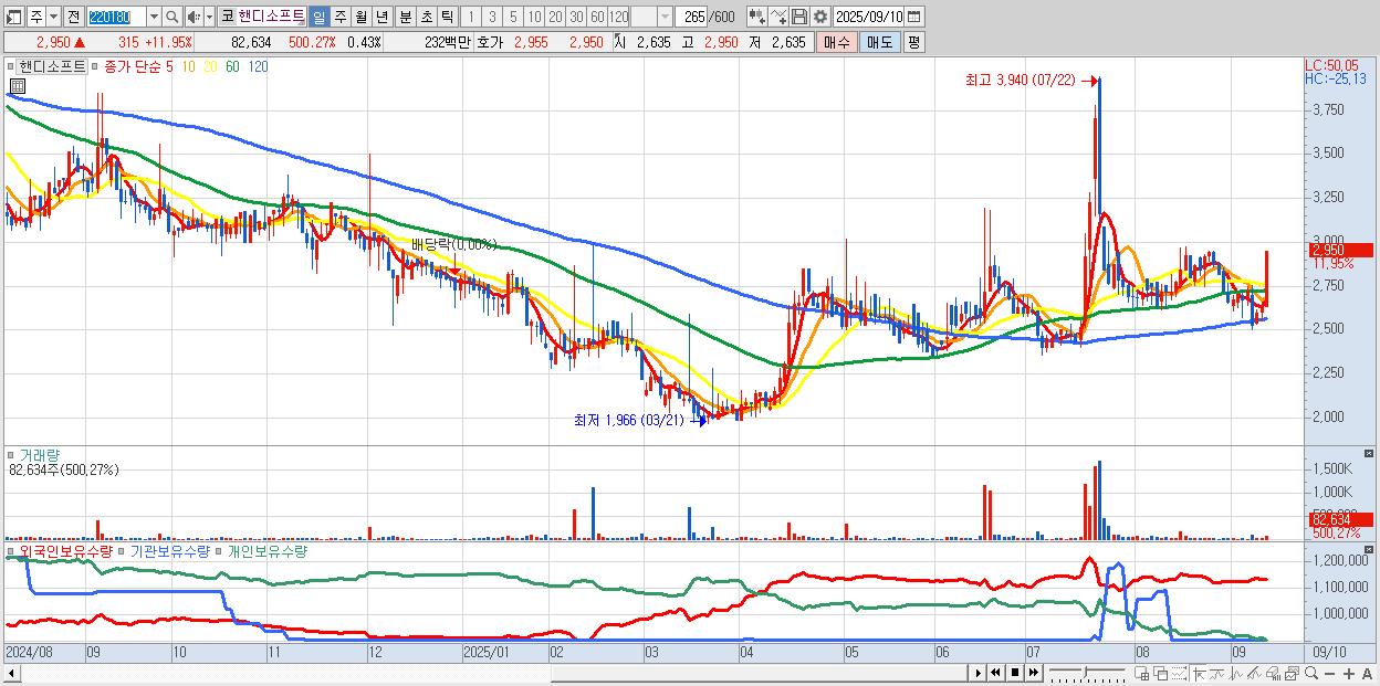 - 핸디소프트 (2,950원 ▲ 11.95% , 시총: 573억, 거래량: 82,634, 거래대금:2억)