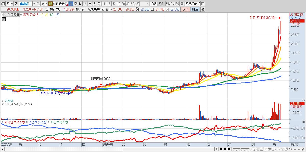 - 세진중공업 (26,050원 ▲ 13.02% , 시총: 14,809억, 거래량: 10,596,307, 거래대금:2,701억)