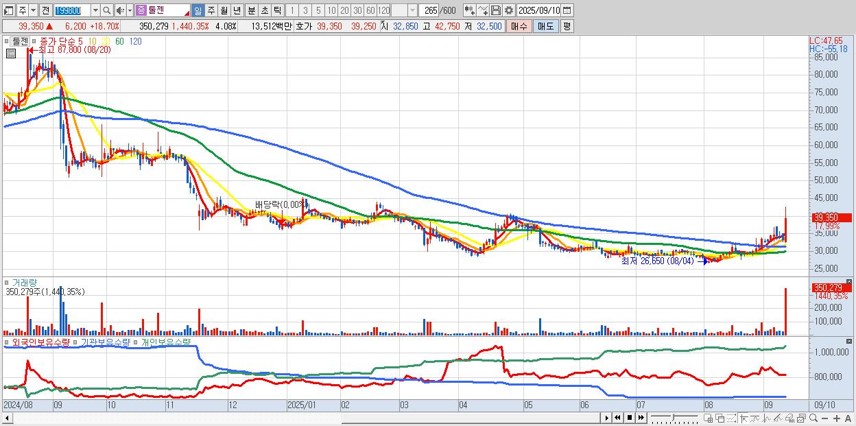 - 툴젠 (40,150원 ▲ 21.12% , 시총: 3,446억, 거래량: 188,875, 거래대금:73억)