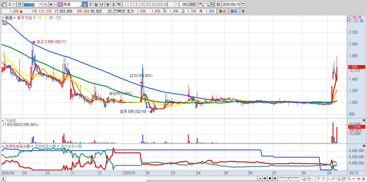 - 베셀 (1,606원 ▲ 12.31% , 시총: 316억, 거래량: 17,653,656, 거래대금:293억)