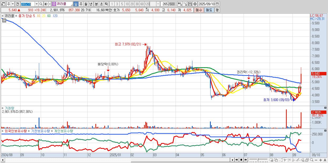 - 큐라클 (5,640원 ▲ 19.24% , 시총: 790억, 거래량: 2,901,976, 거래대금:167억)