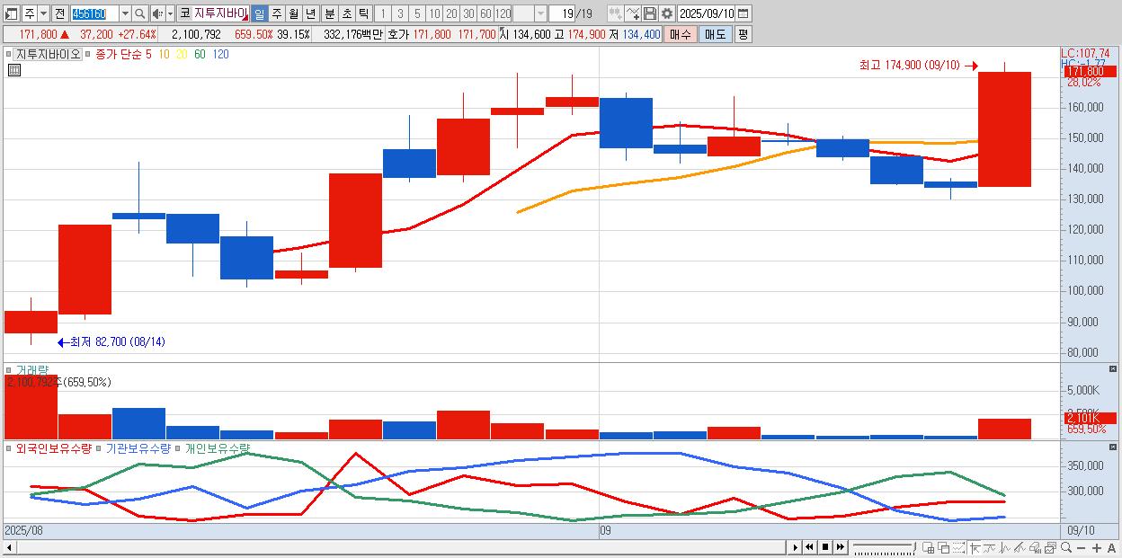 - 지투지바이오 (169,700원 ▲ 26.08% , 시총: 9,106억, 거래량: 1,023,966, 거래대금:1,609억)