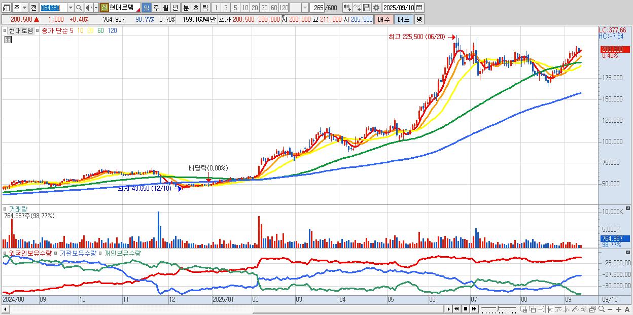 - 현대로템 (208,500원 ▲ 0.48% , 시총: 227,562억, 외국인 순매수 거래금:119억)