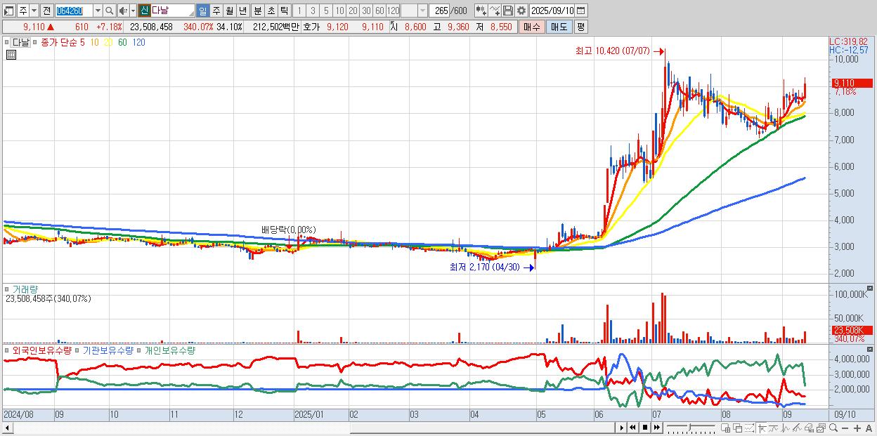 - 다날 (9,110원 ▲ 7.18% , 시총: 6,281억, 외국인 순매수 거래금:123억)