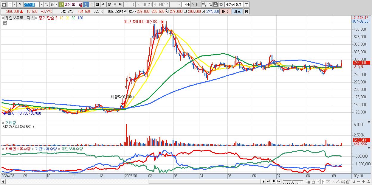 - 레인보우로보틱스 (288,000원 ▲ 3.41% , 시총: 55,872억, 외국인 순매수 거래금:155억)
