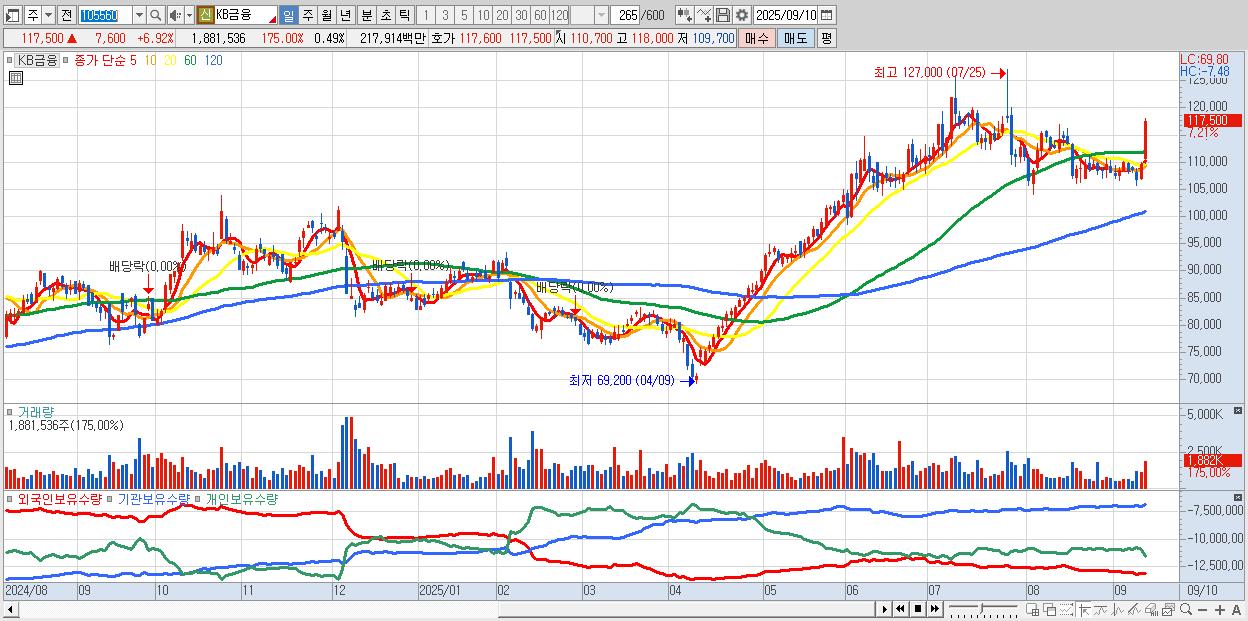 - KB금융 (117,600원 ▲ 7.01% , 시총: 448,599억, 외국인 순매수 거래금:481억)