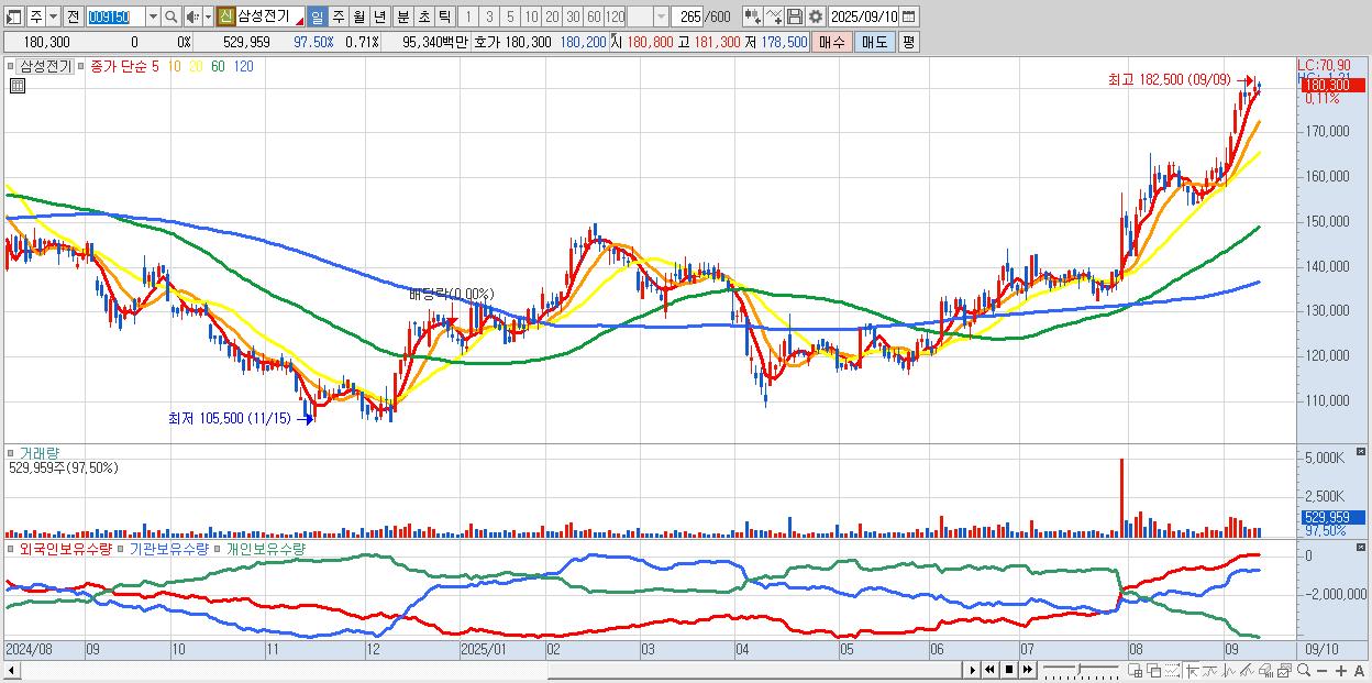 - 삼성전기 (180,500원 ▲ 0.11% , 시총: 134,822억, 외국인 순매수 거래금:107억)