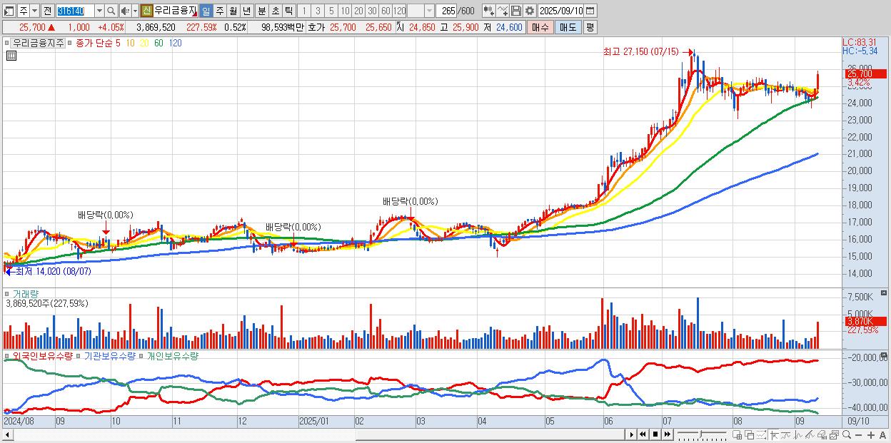 - 우리금융지주 (25,750원 ▲ 4.25% , 시총: 191,217억, 외국인 순매수 거래금:124억)