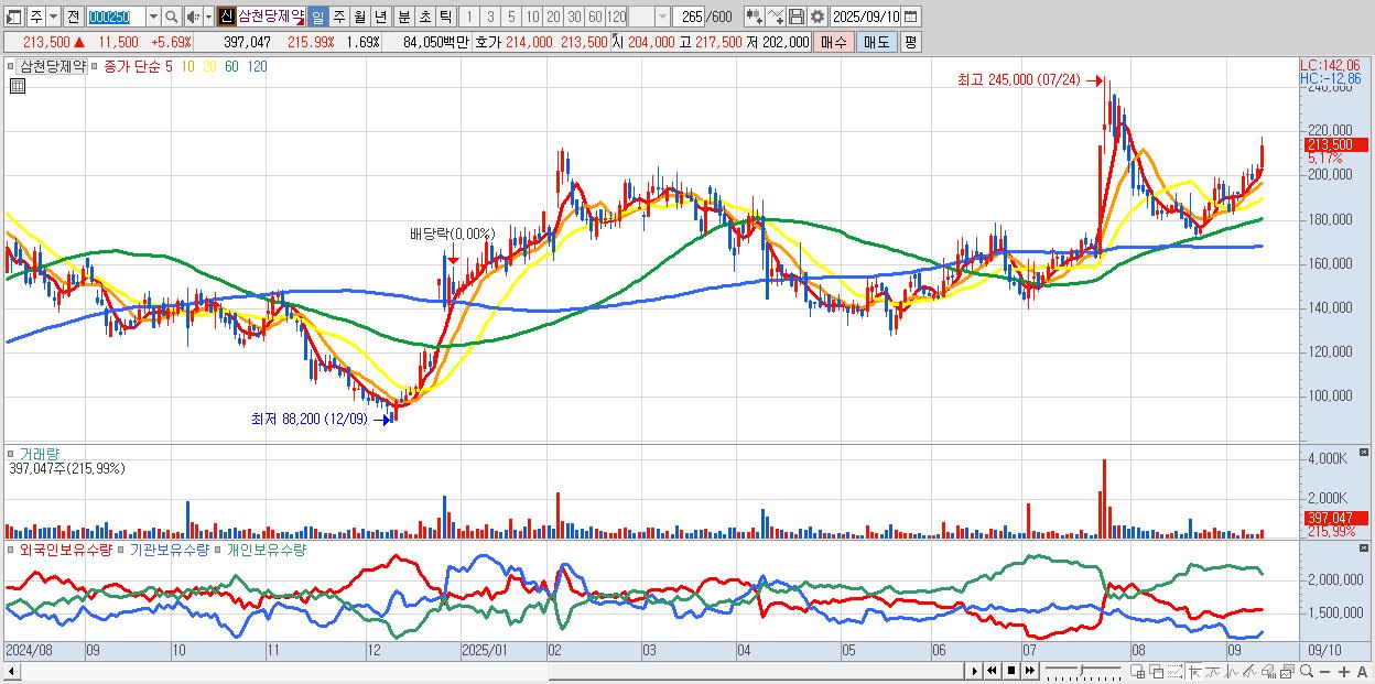 - 삼천당제약 (213,500원 ▲ 5.69% , 시총: 50,082억, 외국인 순매수 거래금:168억)