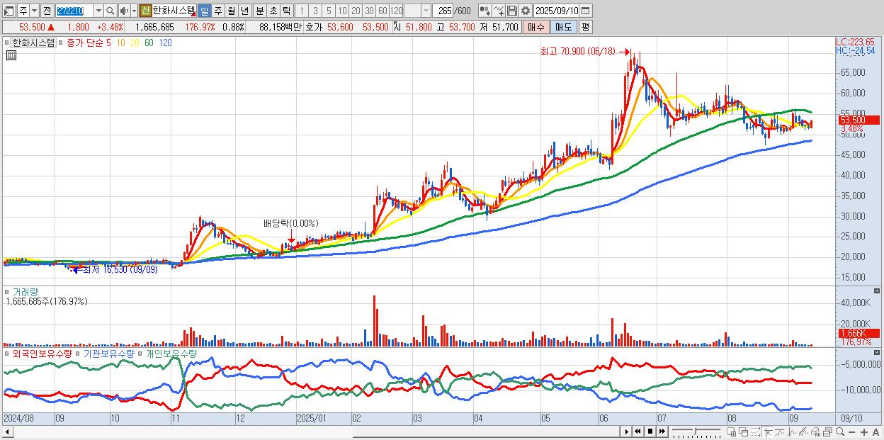 - 한화시스템 (53,600원 ▲ 3.68% , 시총: 101,261억, 외국인 순매수 거래금:162억)