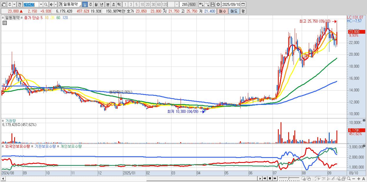 - 일동제약 (23,800원 ▲ 9.93% , 시총: 7,381억, 외국인 순매수 거래금:148억)