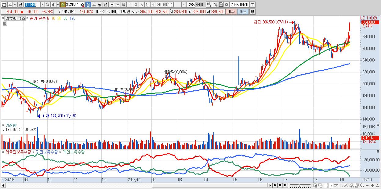 1.SK하이닉스 304,000원 ▲ 5.56% (KOSPI, 000660)