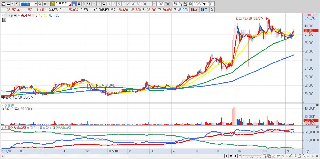 - 한국전력 (38,700원 ▲ 1.57% , 시총: 248,440억, 외국인 순매수 거래금:271억)