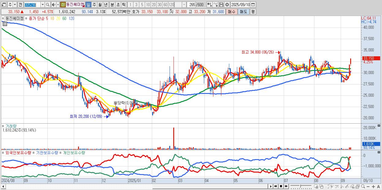- 동진쎄미켐 (33,150원 ▲ 4.57% , 시총: 17,044억, 외국인 순매수 거래금:133억)