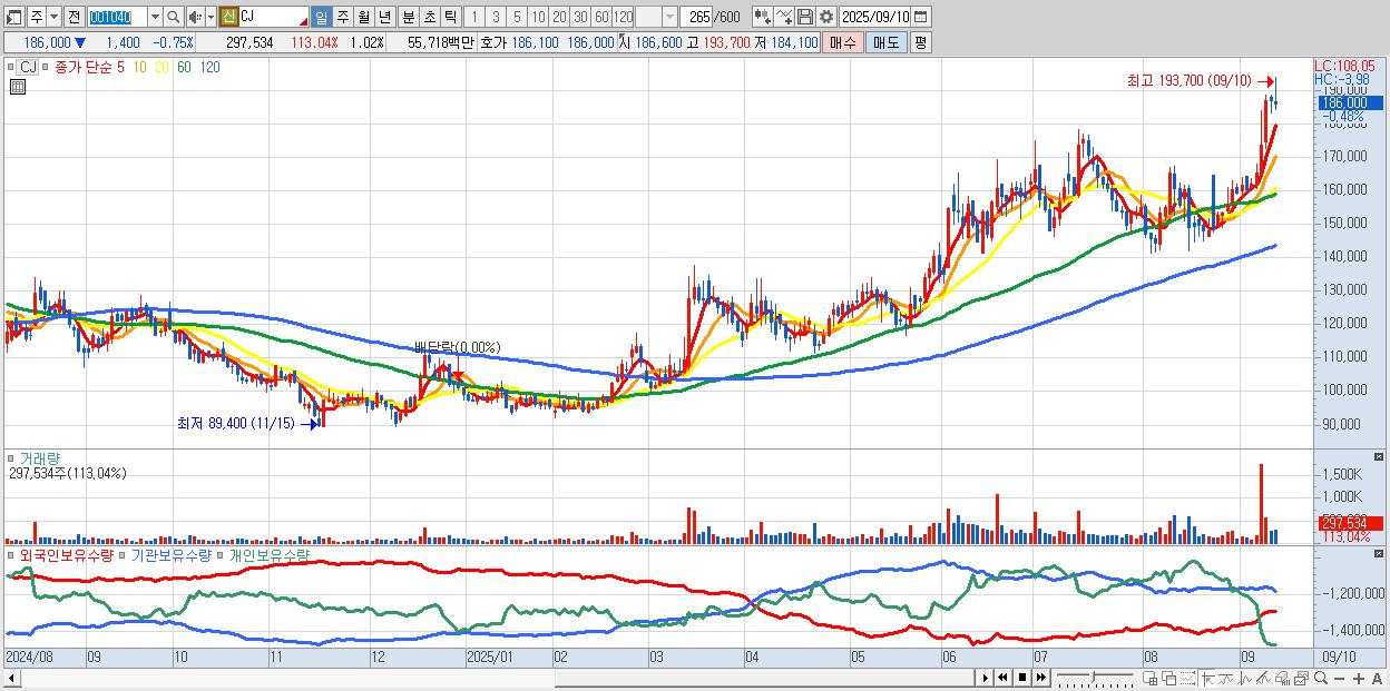 - CJ (185,900원 ▼ -0.8% , 시총: 54,240억, 외국인 순매수 거래금:108억)