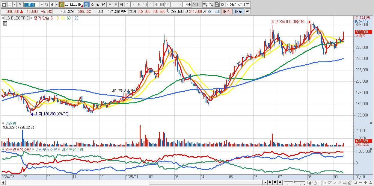 - LS ELECTRIC (308,500원 ▲ 5.47% , 시총: 92,550억, 외국인 순매수 거래금:207억)