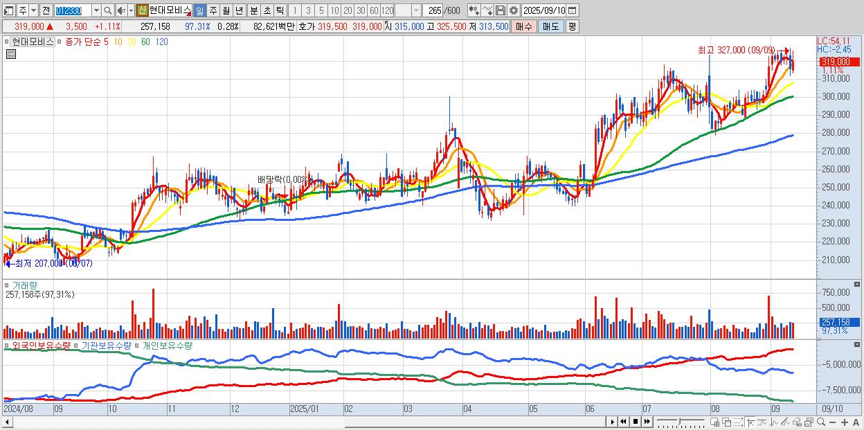 - 현대모비스 (319,000원 ▲ 1.11% , 시총: 292,826억, 외국인 순매수 거래금:190억)