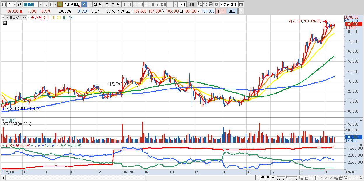 30.현대글로비스 187,500원 ▲ 0.91% (KOSPI, 086280)
