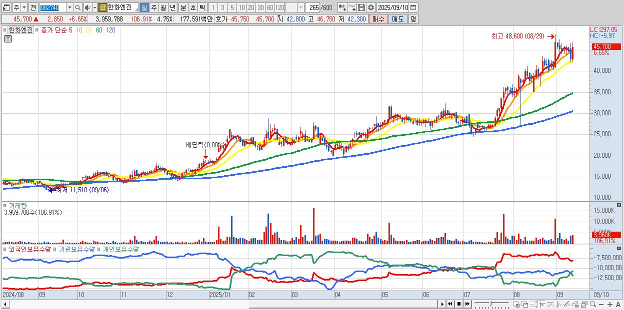 - 한화엔진 (45,700원 ▲ 6.65% , 시총: 38,135억, 외국인 순매수 거래금:362억)