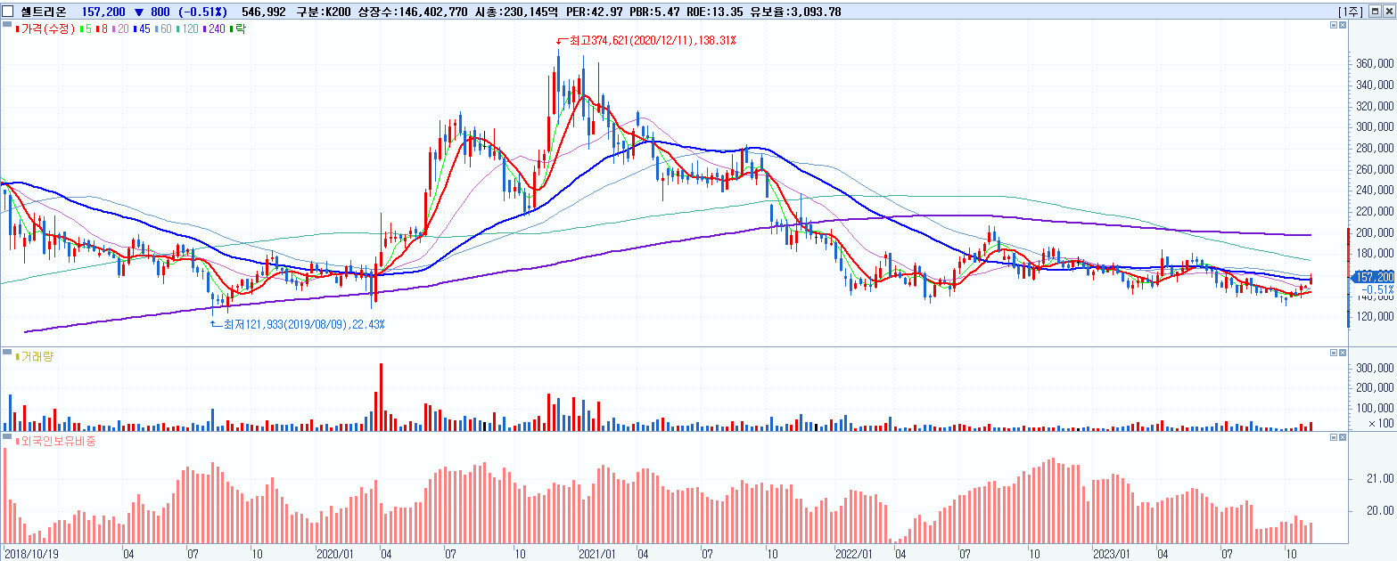 - 셀트리온 (157,200원 ▲ 4.87% , 시총: 230,145억, 거래량: 4,283,466, 거래대금:6,717억, KOSPI)