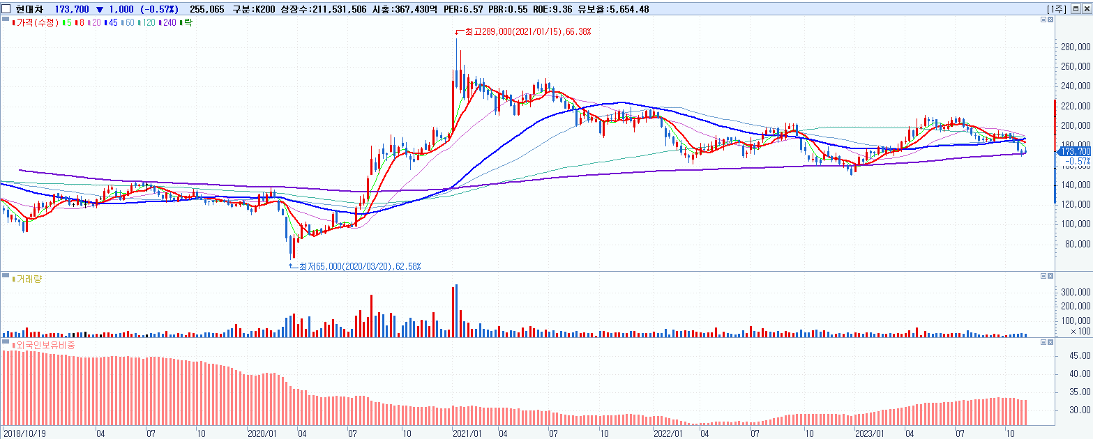 - 현대차 (173,700원 ▲ 0.17% , 시총: 367,430억, 거래량: 2,228,124, 거래대금:3,912억, KOSPI)