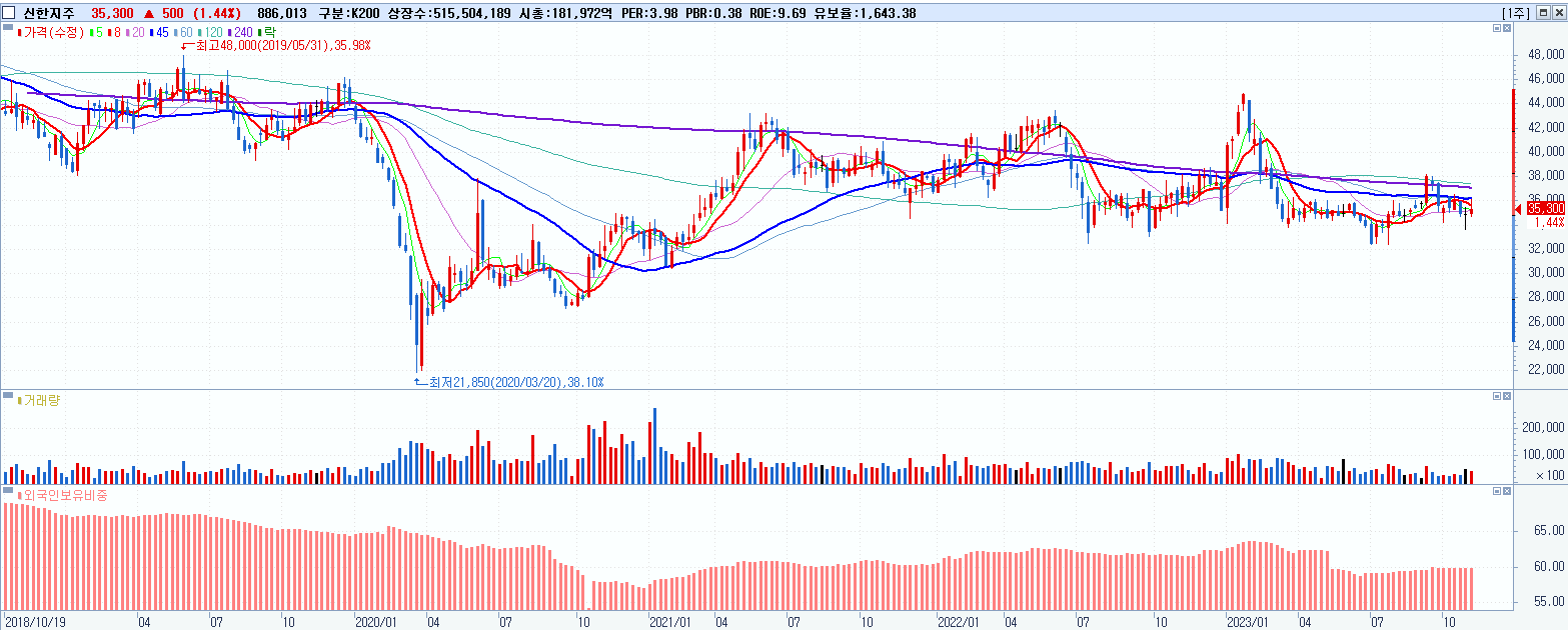 - 신한지주 (35,300원 ▲ 1.15% , 시총: 181,973억, 거래량: 4,763,690, 거래대금:1,672억, KOSPI)