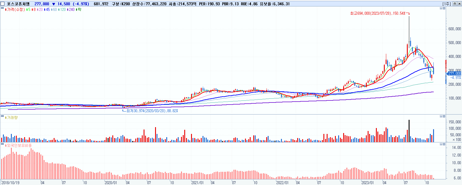 - 포스코퓨처엠 (277,000원 ▲ 2.97% , 시총: 214,573억, 거래량: 9,756,678, 거래대금:31,121억, KOSPI)