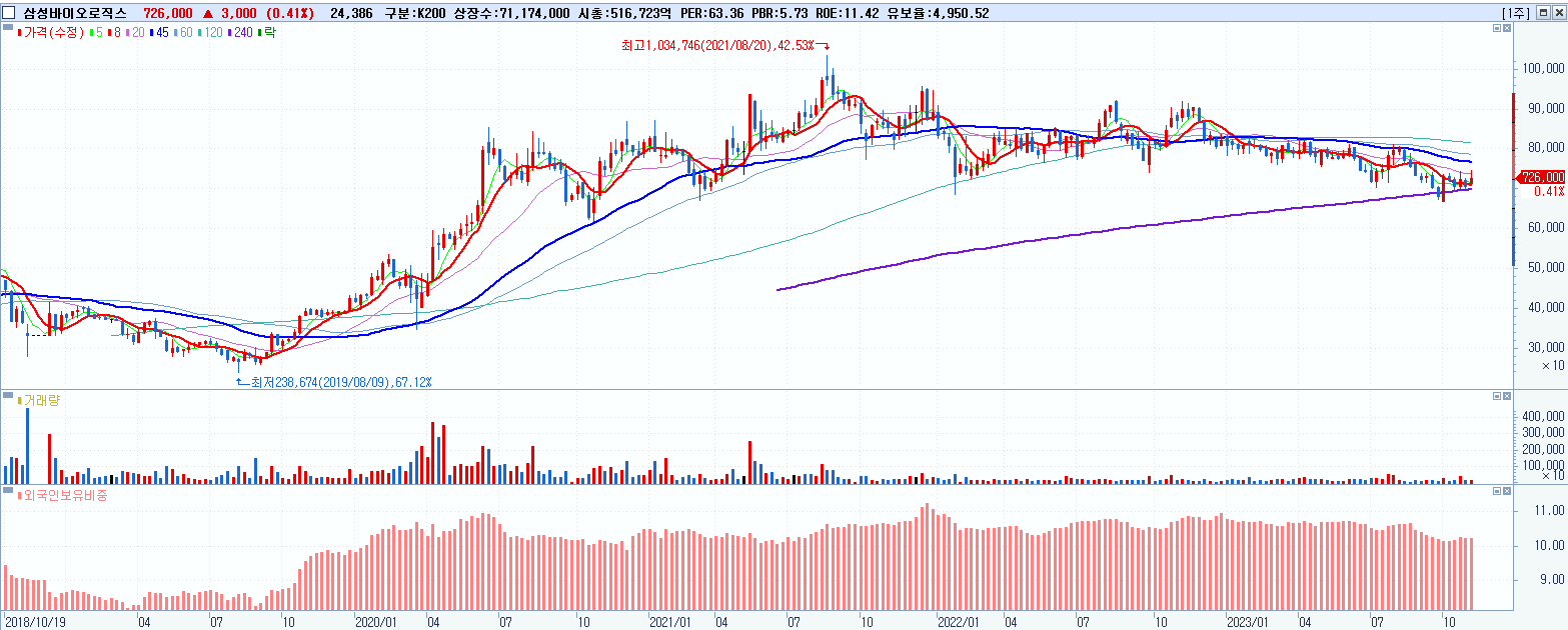 - 삼성바이오로직스 (726,000원 ▲ 2.98% , 시총: 516,723억, 거래량: 223,562, 거래대금:1,624억, KOSPI)