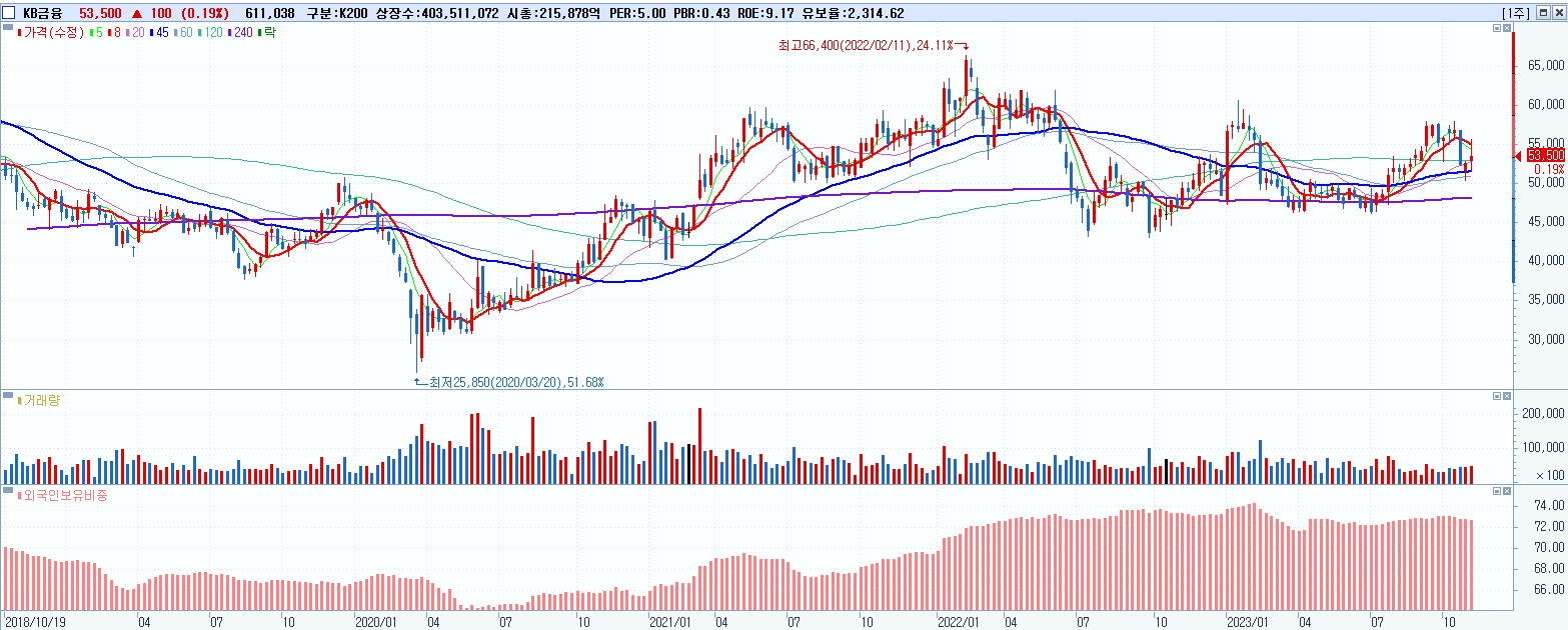 - KB금융 (53,500원 ▲ 1.71% , 시총: 215,878억, 거래량: 5,329,817, 거래대금:2,827억, KOSPI)