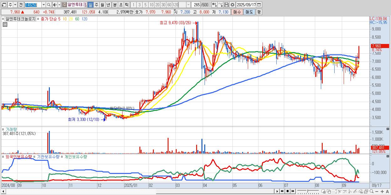- 알엔투테크놀로지 (7,960원 ▲ 8.74% , 시총: 752억, 거래량: 387,481, 거래대금:30억)