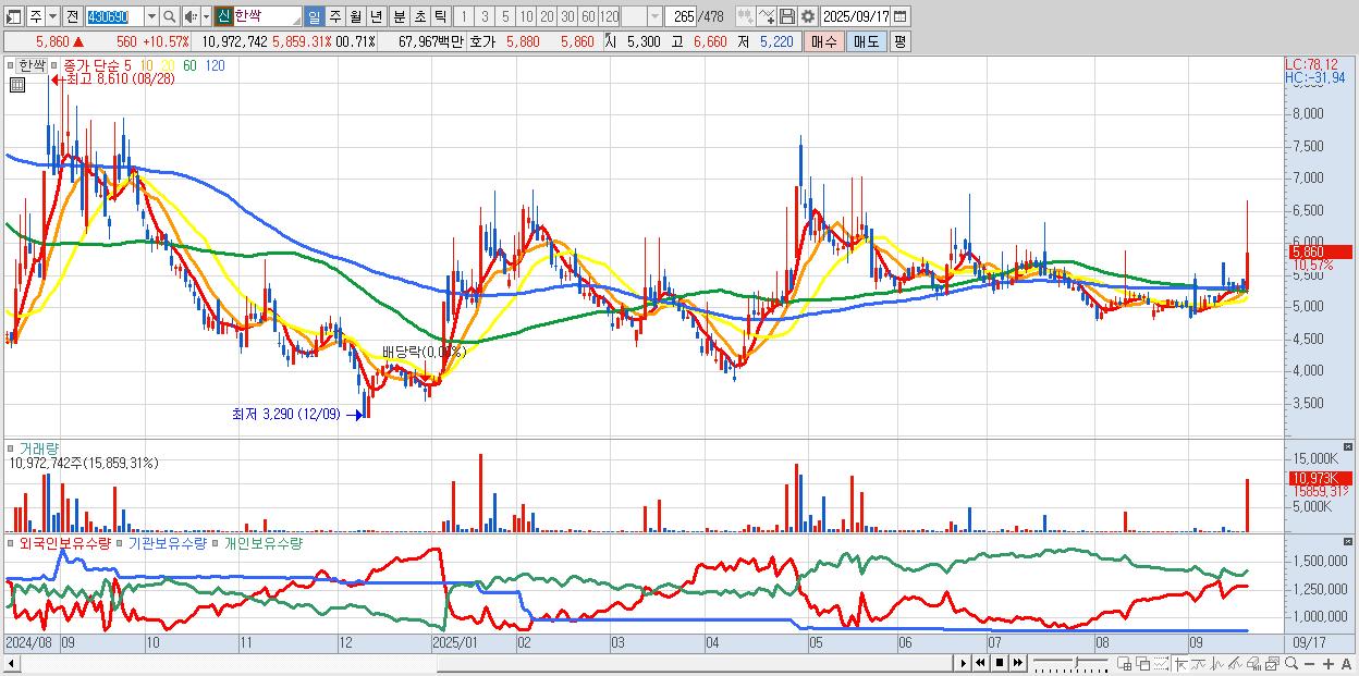 - 한싹 (5,860원 ▲ 10.57% , 시총: 638억, 거래량: 10,972,742, 거래대금:680억)