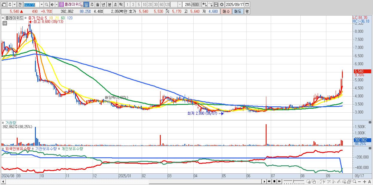 - 플레이위드 (5,540원 ▲ 9.7% , 시총: 486억, 거래량: 392,862, 거래대금:21억)